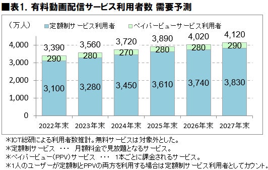 2020年末(12月末)時点の有料動画配信サービス利用者は2,630万人で、このうち定額制サービスの利用者数は9割弱にあたる2,330万人であった。2022年末には3,390万人の利用者のうち定額制サービス利用者は3,100万人へと急増し、さらに2024年末には3,450万人へと拡大した。有料動画配信サービス利用者は増加傾向を続け、2027年にはPPV利用者と合わせて4,120万人にまで拡大すると予測する。今後も定額制サービスの利用者は増加し、2027年には3,830万人に達する見通しだ。