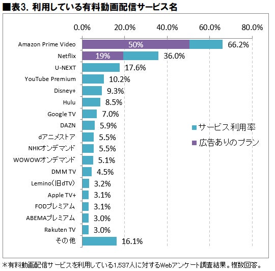 ■有料動画サービス利用率はAmazon Prime Videoが66.2%でトップ、Netflixが36%で2位