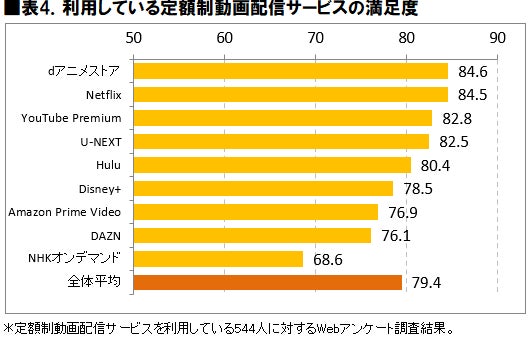 動画サービスの利用者に対して、最も頻繁に利用する定額制サービスの満足度を4段階評価で確認した結果、dアニメストアが84.6ポイントでトップとなった。84.5ポイントで2位につけたのは前回の調査時に満足度が4位であったNetflixで、以下にYouTube Premiumが82.8ポイント、U-NEXTが82.5ポイントと続く。
