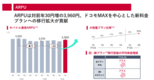 コンシューマ通信では、モバイル通信サービス収入が221億円減少したものの、新料金プラン「ドコモMAX」などの導入により減収幅は縮小した。機器収入は167億円減、固定・その他収入は43億円減となった。競争が激化する中でも、販促施策の強化によってポートインユーザー(他社からの乗り換え)は増加し、下期も顧客基盤の拡大を目指す構えだ。新料金プラン「ドコモMAX」は6月に開始され、9月時点で契約者数が150万を突破。年度末までに300万契約を目標としている。ARPU(1契約あたりの平均収入)は前年同期比30円増の3960円となり、ドコモMAXを中心とした大容量プラン比率の上昇が寄与した。今後は「選べる特典」や音楽・ドラマなどエンタメ特典の拡充により、ブランド価値の向上を図るとしている。