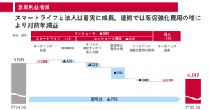 セグメント別にみると、コンシューマ部門の営業収益は2兆2087億円で前年同期比0.5%減、営業利益は21.8%減の3251億円となり、通信収入や機器収入の減少が影響した。対照的にスマートライフ分野は6249億円(5.9%増)と堅調で、金融やエンタメ事業が寄与した。法人部門は9380億円(6.7%増)で、営業利益も1497億円(8.6%増)と着実に成長を続けている。法人とスマートライフはともに増益となったが、個人通信分野の競争激化と販促費の増加が全体の利益を圧迫したようだ。