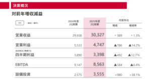 NTTは2025年11月4日、2025年度第2四半期決算を発表した。連結決算は、営業収益が前年同期比1.3%増(389億円増)の3兆327億円、営業利益が14.2%減(786億円減)の4747億円、四半期利益は12.7%減(492億円減)の3398億円で、増収減益となった。EBITDAは8563億円(6.4%減)と減少したが、設備投資は3555億円(38.1%増)と大幅に拡大した。法人・スマートライフ分野が伸びる一方、コンシューマ通信の減収が響いた形だ。