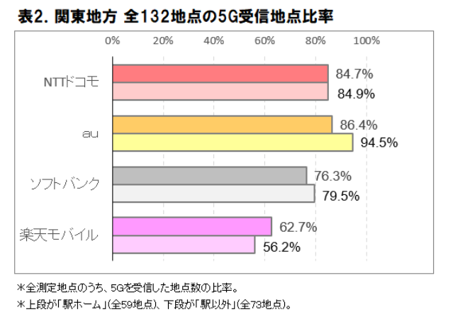 5G受信地点比率は、「駅ホーム」、「駅以外」ともにauがトップであった。