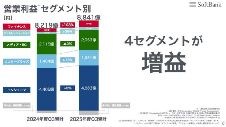 その他の事業セグメントも概ね堅調に推移している。ファイナンス事業は、PayPayおよびPayPayカードの決済取扱高(GMV)が前年同期比24%増の14.3兆円と、大きく伸長した。
