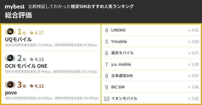 mybestによる比較検証の結果、総合評価1位は「UQモバイル」。