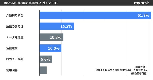 はじめに、現在または過去に格安SIMを利用したことがある男女911人を対象にアンケート調査を行ったところ「格安SIMを選ぶ際に重視したポイント」として、51.7%の利用者が「月額利用料金」を選んだ。次いで、15.3%の利用者が「通信の安定性」、10.8%の利用者が「通信速度」といった通信環境を重要視したポイントとして選択した。