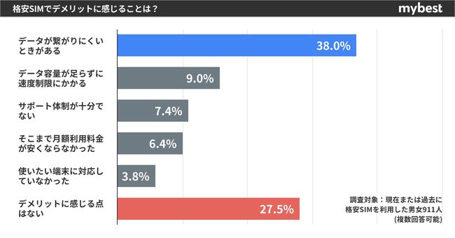 一方で「格安SIMのデメリットを感じない」という利用者が全体の27.5%おり、一部の利用者において、格安SIMのサービスに対するある程度の満足を得られているといえる。