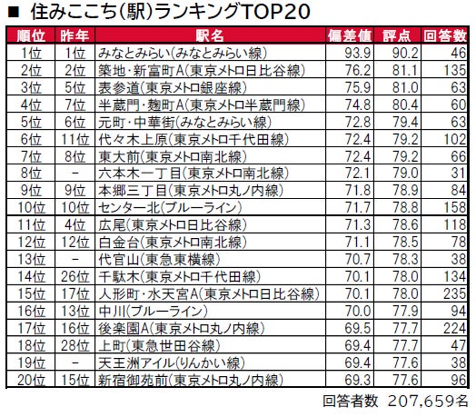1位は、2年連続でみなとみらいとなっている。2位は、3年連続で築地・新富町A、3位は、昨年5位だった表参道が順位を上げた。6位には、昨年11位だった代々木上原、8位には、昨年は回答者数が30名に満たなかったため集計対象外だった六本木一丁目がそれぞれトップ10入りしている。上位10位のうち、3駅は神奈川県内の駅(みなとみらい、元町・中華街、センター北)であった。