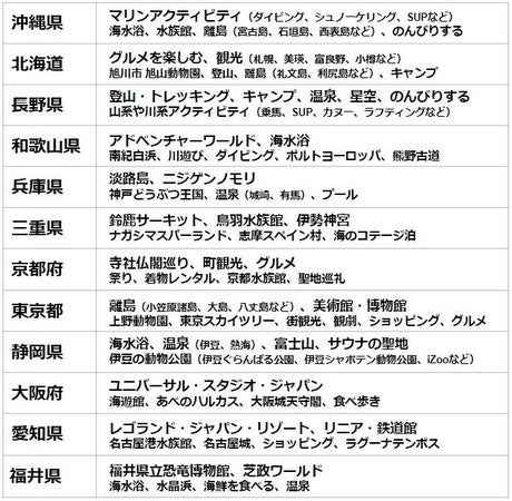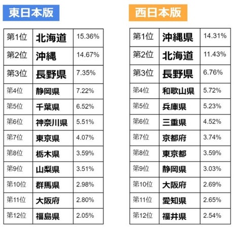 東日本版では「北海道」、西日本版では「沖縄県」が1位となる結果となった。どちらも1年を通して旅行先として人気が高くなっている。第2位には、東日本が「沖縄県」、西日本では「北海道」が続く結果となった。