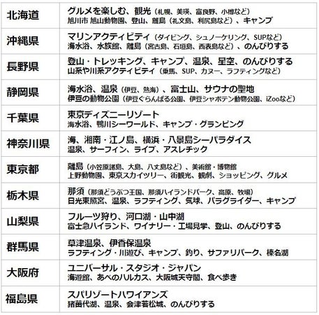 この夏の旅行先としては近場を挙げる声が多く、かつ「自然に触れて夏を感じながら遊びたい」という声が多く聞かれ、夏らしく海や山で思いっきり遊べる自然豊かな都道府県が人気となっていることが伺える。