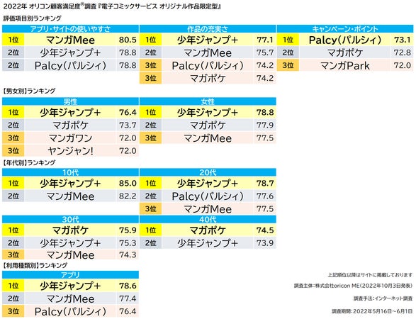 総合ランキングを構成する、全3つの評価項目別では、【マンガMee】が「アプリ・サイトの使いやすさ」で、【少年ジャンプ+】が「作品の充実さ」で、【Palcy】が「キャンペーン・ポイント」で1位となった。