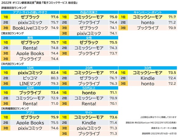 総合ランキングを構成する、全3つの評価項目別では、【ゼブラック】が「アプリ・サイトの使いやすさ」で、【コミックシーモア】が「作品の充実さ」「キャンペーン・ポイント」で1位となった。
