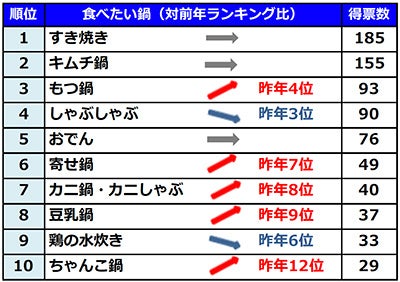 昨年12位だった「ちゃんこ鍋」は2ランク上昇で10位にランクアップ。「野菜・肉・魚介をバランスよくとれるから」「具材の味を楽しめる」「出汁が好き」などのコメントが寄せられた。