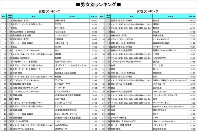 (1)男性部門トップは伊藤忠商事。2位の任天堂を筆頭に、「スポーツ・ゲーム」が30位以内に5社ランクイン