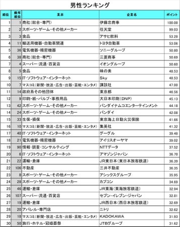 男性部門トップは、伊藤忠商事。2位は、「あつまれ どうぶつの森」がヒットした任天堂。任天堂を筆頭に、13位のバンダイナムコエンターテインメント、14位のバンダイなど、「スポーツ・ゲーム」が30位以内に5社入った。女性部門では、「スポーツ・ゲーム」のランクインは30社中1社に留まっており、女性よりも男性のほうが「ゲーム」への人気が高いことが分かる。9位にSkyが入った他、17位のグーグル、20位のアマゾンジャパンなど「IT・ソフトウェア」が支持を集めている点も、女性部門と比較した際の特徴となっている。