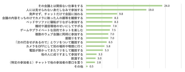 約4人に1人が「別の仕事に精を出す」ことを経験。あまり自分が発言する状況ではなく、人の話を聞いているだけの会議では、その誘惑に駆られることも分かる。また、割合は少ないものの、「居眠りをする」(7.0%)、「他の人に成りすまして参加する」(3.3%)、「飲酒する」(3.0%)等の剛の者が居るのも見逃せない。