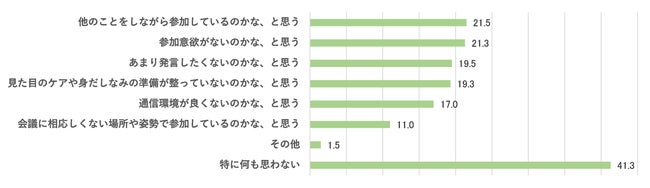 「特に何も思わない」が41.3%と多いものの、「他のことをしながら参加しているのかな、と思う」(21.5%)、「参加意欲がないのかな、と思う」(21.3%)と、ネガティブな印象を持たれるケースがあることが伺える。このようなネガティブな意見は、「自分はON派」の人のほうが多く出ている傾向があり、ON派とOFF派が混在する会議の場合、心象には注意する必要がありそうだ。