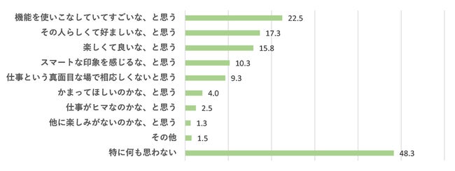 バーチャル背景の使い手は、他の人からはどう見られているのか。「特に何も思わない」(48.3%)と完全スルー派が多数居る中ではあるが、「機能を使いこなしていてすごいな、と思う」(22.5%)、「その人らしくて好ましいな、と思う」(17.3%)、「楽しくて良いな、と思う」(15.8%)など、好意的に捉える人も一定数居るのが印象的だ。