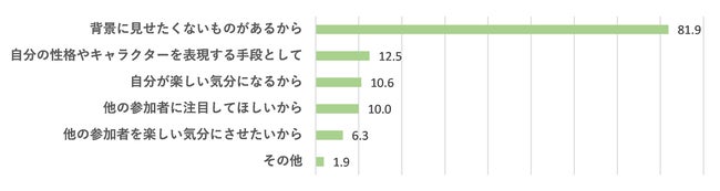 使用経験あり派の人にバーチャル背景を使用した理由を問うと、「背景に見せたくないものがあるから」(81.9%)が圧倒的多数に。また、数は少ないものの、「自分の性格やキャラクターを表現する手段として」(12.5%)、「自分が楽しい気分になるから」(10.6%)など、自己表現の手段や遊び心で使用している人も居るようだ。