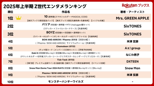 楽天は6月19日に「2025年上半期 Z世代エンタメランキング」を発表した。このランキングは「楽天ブックス」「楽天Kobo電子書籍ストア」「楽天マガジン」「Rakuten Music」「Rakuten TV」の各サービスにおけるZ世代(15歳~26歳)の利用傾向を分析したもので、若年層の顧客エンゲージメントと満足度を映し出すものとなっている。