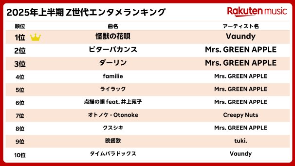 「Rakuten Music」では、Vaundyの「怪獣の花唄」がロングヒットで1位に輝いている。Mrs. GREEN APPLEの楽曲も新旧問わず多数ランクインしており、Z世代がコンテンツのリリース時期に縛られず、質の高い作品を享受していることが示された。これは、良質なコンテンツが提供され続ければ、ユーザーは長期的にサービスを利用し、満足し続けることを意味する。