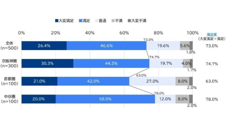 注目すべきは、来場者の高い満足度である。5月13日までに万博を訪れた人々の満足度(「大変満足」+「満足」)は、全体で73.0%、「大変満足」の割合も30.3%と他の地域(首都圏21.0%、中京圏20.0%)より高い結果となった。