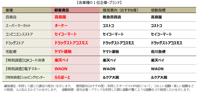 また、宅配便業種ではヤマト運輸が1位(74.7)となり、再配達の利便性や配送時間の正確性などが支持を集めた。ドラッグストア業種ではサンドラッグ(75.6)が顧客満足度で首位となり、価格競争力と商品陳列の工夫が強みとされた。ネットショッピング業種では、アマゾンジャパンが78.1と高スコアで1位を確保しており、配送スピードや品揃えが利用者からの評価につながっている。