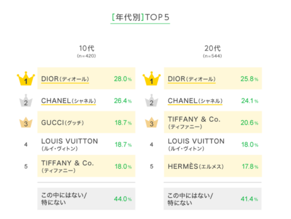 年代別では、10〜20代では「DIOR(ディオール)」と「CHANEL」が上位を占めた。特に10代女性では「DIOR」を挙げた割合が5割弱と突出しており、コスメや香水など若年層でも手に取りやすい商品が多いことが背景にあるようだ。また、俳優やアイドルをアンバサダーに起用することで“推し”をきっかけにブランドに関心を持つケースも増えていると考えられる。