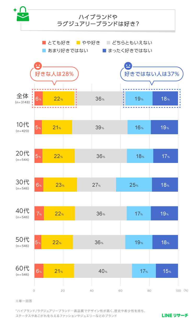 プレゼントや自分へのご褒美として人気の高いブランドアイテム。LINEリサーチが全国の15〜69歳の男女を対象に実施した調査によると、憧れのハイブランド・ラグジュアリーブランドのトップ2は「LOUIS VUITTON(ルイ・ヴィトン)」と「HERMÈS(エルメス)」だった。年代や性別によって好まれるブランドに明確な違いが見られ、ライフステージや価値観の多様化がうかがえる結果となった。まず、ハイブランドやラグジュアリーブランドに対する好意度について尋ねたところ、全体では「どちらともいえない」が最も多く3割台半ばに達した。「とても好き」「やや好き」を合わせた【好き】の割合は3割弱で、「あまり好きではない」「まったく好きではない」を合わせた【好きではない】は4割弱という結果だった。年代別では、どの世代も【好き】の割合が2割台半ば〜3割前後と大きな差はなかったが、30代では【好きではない】が4割強とやや高めとなった。