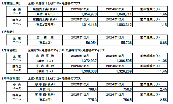 2025年12月度コンビニ売上高は全店・既存店ともに10ヶ月連続増