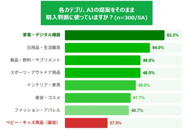 カテゴリ別の信頼度にも差がある。「AIの提案をそのまま購入判断に使える」と答えた割合は「家電・デジタル機器(63.3%)」が最も高く、「日用品・生活雑貨(54.0%)」が続いた。一方、パーソナルな要素が強い「ベビー・キッズ用品」や「ファッション・アパレル」「美容・コスメ」では、AIの提案をそのまま使えないと判断する割合が高い傾向がみられた。