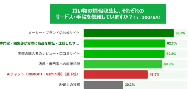 買い物の情報源に関する信頼度では、「メーカー・ブランドの公式サイト(69.3%)」が最も高く、「専門家・編集部が実際に商品を検証・比較した商品比較サイト(62.7%)」「購入者のレビュー・口コミサイト(62.3%)」が続いた。AIチャット(ChatGPT・Geminiなど)は49.3%と、調査した全項目の中で低い水準だった。