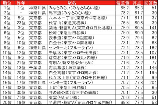 今年の「住みここち(駅)ランキング」のトップは、5年連続で神奈川県横浜市西区のみなとみらい(みなとみらい線)となった。みなとみらいは唯一偏差値80台を記録しており、極めて高い評価を得ている。みなとみらい線で横浜駅まで近く、周辺には大規模商業施設やホテル、遊園地などの観光スポットが集まり、「賑わい」因子で2位、「行政サービス」因子で5位と評価が高い。