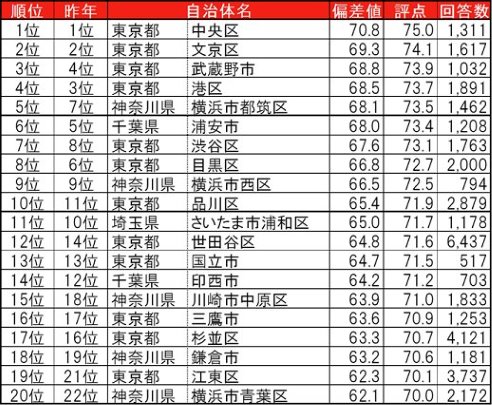 評価は、現在住んでいる街への満足度を点数化し、その平均値と偏差値で算出されている。駅ランキングは駅徒歩15分以内に居住する回答者が30名以上の駅を、自治体ランキングは回答者50名以上の地域が集計対象となっている。