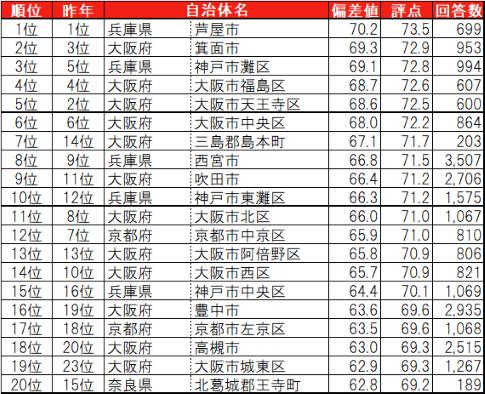 自治体別のランキングでは、兵庫県芦屋市が3年連続で1位となり、唯一偏差値70台の高評価を獲得した。2位には大阪府箕面市、3位には兵庫県神戸市灘区が入り、いずれも前年から順位を上げている。トップ10には、大阪府三島郡島本町(7位)など、郡部の町もランクインしている点が特徴的だ。