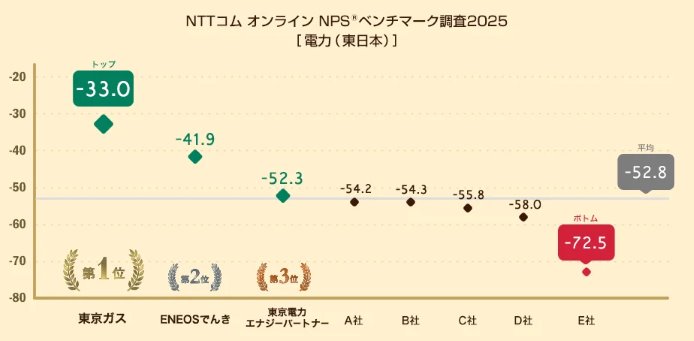 NTTコムオンラインが実施した電力業界のNPS(Net Promoter Score)ベンチマーク調査2025において、これまで新電力が優位に立っていた顧客推奨度において、一般電気事業者(大手電力会社)が初めて新電力を上回る結果となった。
