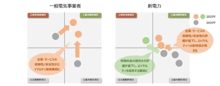特に興味深いのは、一般電気事業者と新電力の評価の逆転現象だ。一般電気事業者のNPSは年々向上している一方で、新電力は低下傾向にある。この背景には、一般電気事業者において「企業の信頼性やブランドイメージ」「サービスの信頼性・安定性」の重要度が高まったことがある。一方、新電力では「利用料金の適切さ」への評価が低下し、満足度を押し下げる要因となっている。