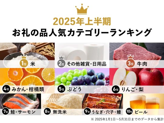 株式会社トラストバンクが運営する「ふるさとチョイス」は、2025年上半期(1月1日~5月31日)に最も寄付件数を集めた「お礼の品人気カテゴリーランキング」を特集ページ「2025年上半期 人気ランキング&トレンド振り返り」で公開した。