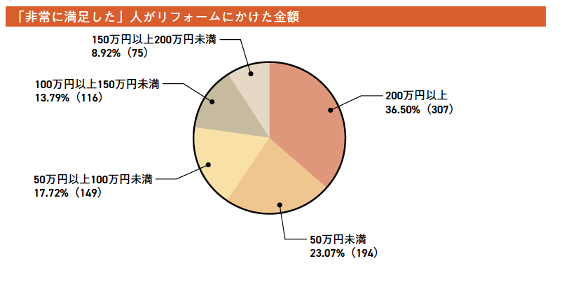 「非常に満足した」と回答した層がリフォームにかけた金額を見ると、「200万円以上」36.50%、「50万円未満」23.07%、「50万円以上100万円未満」17.72%となった。