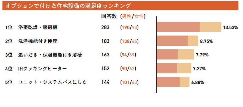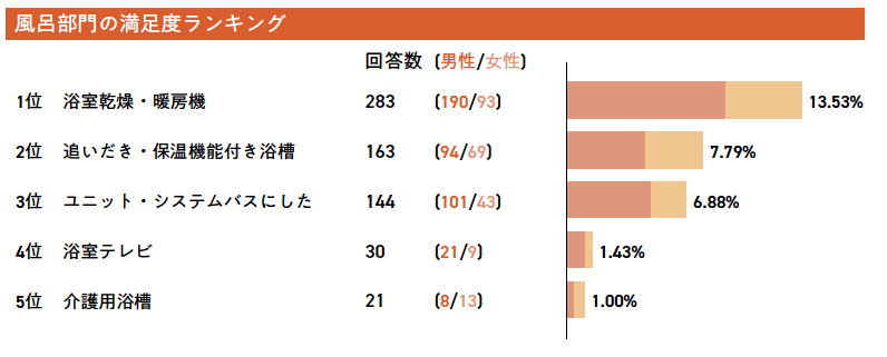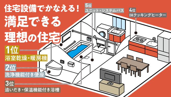 アンケート1位は「浴室乾燥・暖房機」で、そのほか浴室関連が上位にランクイン。冬場の洗濯に困る人が多いため浴室乾燥機が使えることや、急激な温度変化で血圧が大きく変動することなどが原因のヒートショックへの対策など、温度管理がなされている浴室に対する満足度が高いと見て取れた。