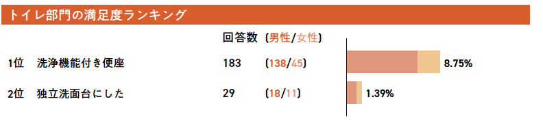トイレ部門では、「洗浄機能付き便座」8.75%、「独立洗面台にした」1.39%の順。トイレは、快適性を考慮したリフォームになっている。