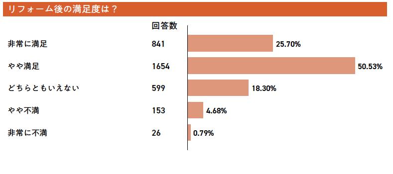 リフォームを行った3,273人のうち、「リフォーム後の満足度は?」という質問に対し、「非常に満足」「やや満足」と答えたのは合計で76.23%で、4人に3人の人が満足していることが分かる。