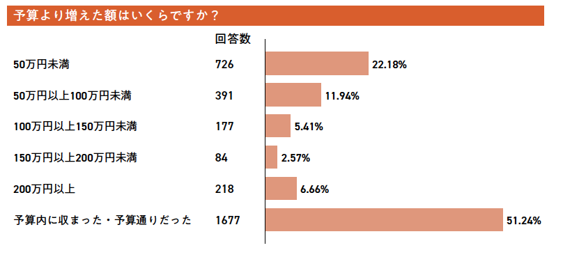 また、事前に考えた予算と実際にかかった金額についての質問は、当初の予定通りの額だった層は51.24%で最多。次いで、増加額が「50万円未満」が22.18%と続く。