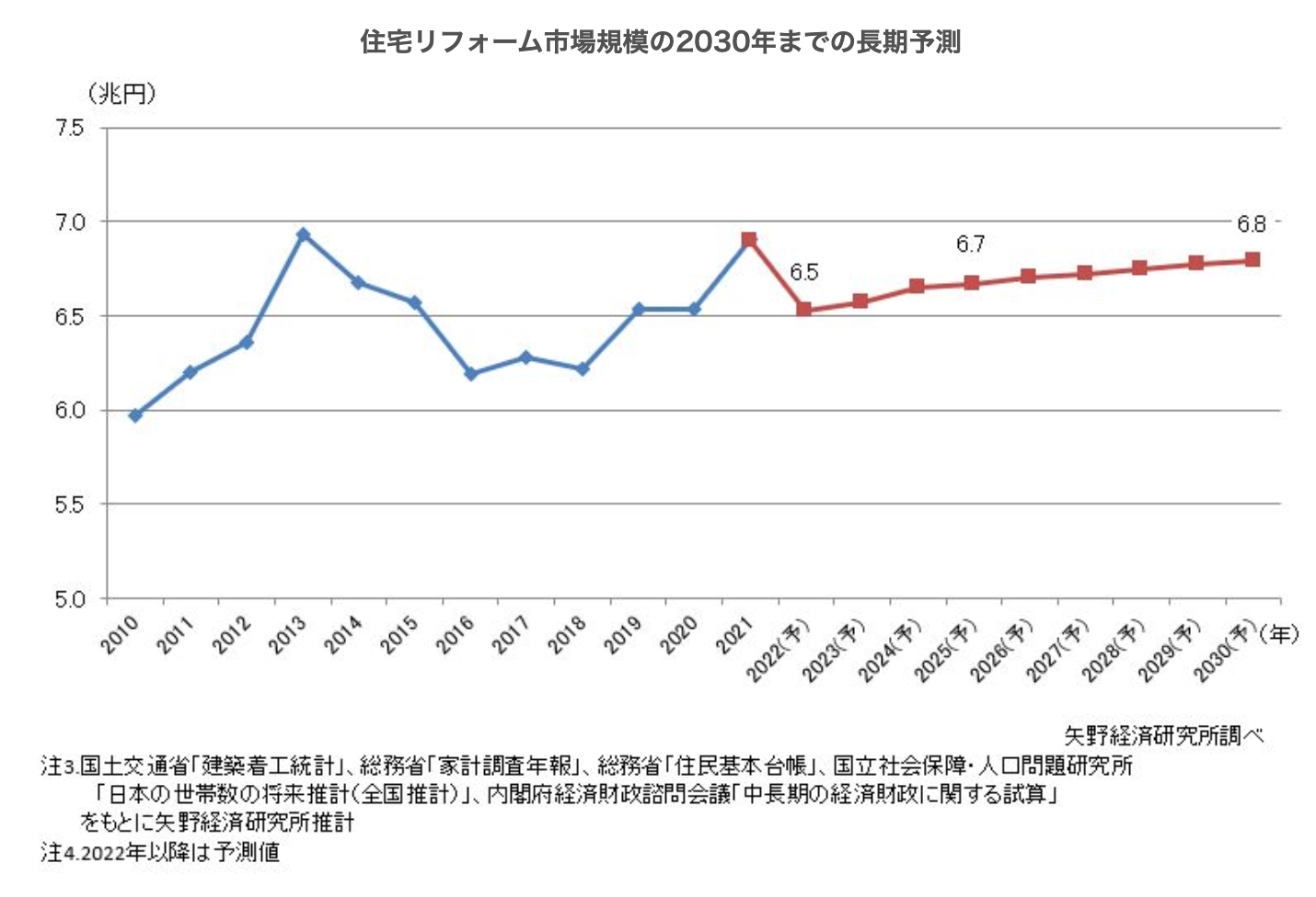 矢野経済研究所は2021年は、新型コロナウイルスの感染拡大により外出自粛が続く中、一部でマイナス影響があったが、在宅時間が長くなったことで住空間への関心が高まるなど、プラス影響を大きく受けてか、増加で推移した、と発表した。2022年の住宅リフォーム市場規模は前年比5.5%減の6.5兆円、2023年は同0.7%増の6.6兆円と予測している。