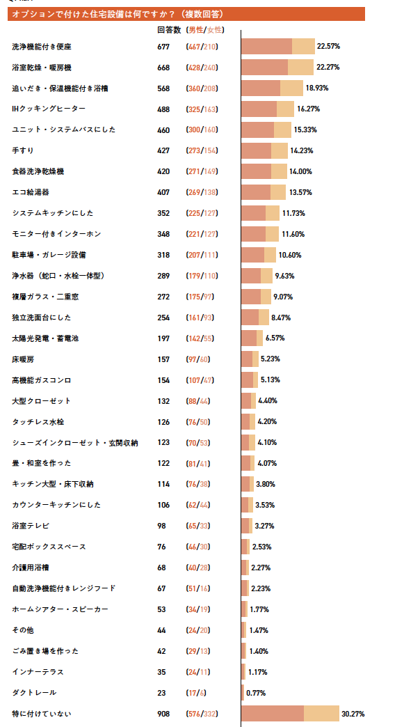 複数選択制の「リフォームで付けたオプション」についての回答は、「風呂の暖房」「洗浄機機能付きトイレ」が多くを占める結果にいた。また、3,000人中908人の30.27%は、「特に付けていない」と回答したことから、7割もの人がリフォームをする際にオプションで住宅設備を付けていた。