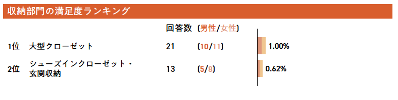 収納部門では、「大型クローゼット」が1%、「シューズインクローゼット・玄関収納」は0.62%となった。新しく収納する場所を作るというよりも収納力アップのリフォームが定番のようで、どちらの人気も同じくらいだった。