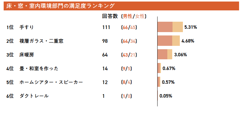 床・窓・室内環境部門では、1位「手すり」5.31%で、納得の結果に。「複層ガラス・二重窓」「床暖房」も負けず劣らずの人気で、安全性と暖かさを中心にリフォームしていることが分かる。他の項目と違い、室内環境では、上位3つの箇所が多い傾向にある。