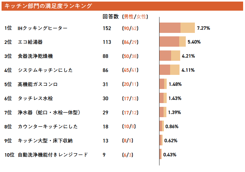 リフォーム箇所別に、住宅設備の満足度をランキングした。