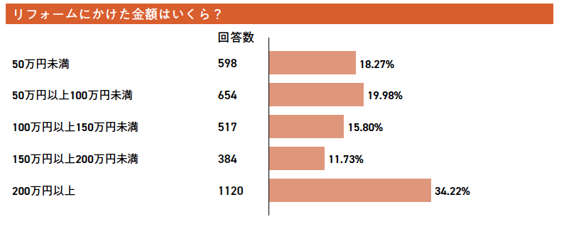気になるリフォーム代金で最も多かったのは「200万円以上」が34.22%と、比較的高額だったことが分かった。