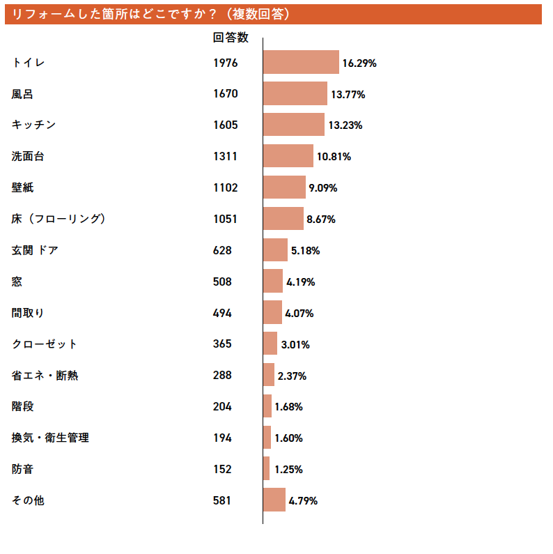人気のリフォーム箇所は、1位「トイレ」16.29%、2位「風呂」13.77%、3位「キッチン」13.23%と続く。